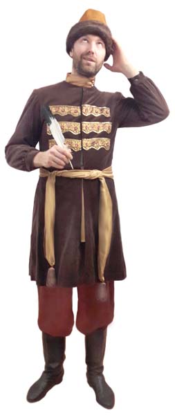 В костюм входит: Кафтан, рубашка, шаровары, сапоги, пояс, шапка.