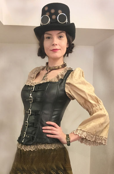 В костюм входит: Блузка, корсет, юбка, цилиндр, ожерелье, браслет.