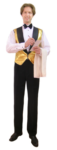 В костюм входит: рубашка, брюки, бабочка, жилет.